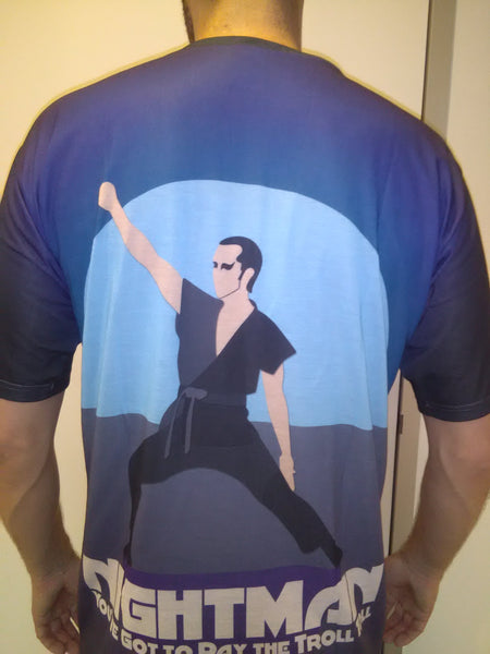 Feed into your dark side with our It's Always Sunny in Philadelphia inspired design, The Nightman T-Shirt! This vibrant, all-over print tee shows the Nightman, a character in Charlie's first musical endeavor. He's got eyes like a cat and does karate across the stage. No trolls but a small toll and this shirt can be yours!