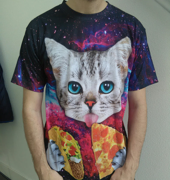 You've got to be kitten me right meow! All this style in one shirt!? Taco Cat T-Shirt is the perfect addition to any closet! Not only does this shirt include a blue eyed kitty, but a slice of pizza and taco! Three of the best things this planet has to offer, all on a shirt that's out of this world! Get it today!